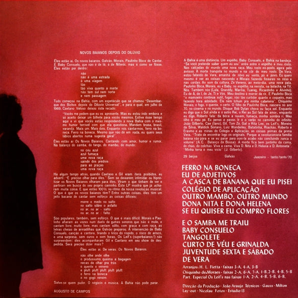 Lang voordat Os Novos Baianos de Braziliaanse muziek voorgoed veranderden met Acabou Chorare, was er É Ferro na Boneca!. Dit debuutalbum uit 1970 is een explosieve en onvoorspelbare mix van psychedelische rock, Latijns-Amerikaanse ritmes en een flinke dosis tegendraadse energie. De plaat toont de band in zijn puurste, meest onstuimige vorm, vol met vervormde gitaren en de kenmerkende vocalen van Baby Consuelo en Moraes Moreira. Het is een rauw en essentieel document van een van de meest invloedrijke groepen uit Brazilië.